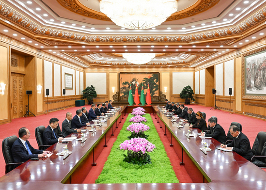 9月2日下午,国家主席习近平在北京人民大会堂会见来华出席2025年上海合作组织峰会和纪念中国人民抗日战争暨世界反法西斯战争胜利80周年活动的土库曼斯坦总统别尔德穆哈梅多夫。新华社记者 饶爱民 摄